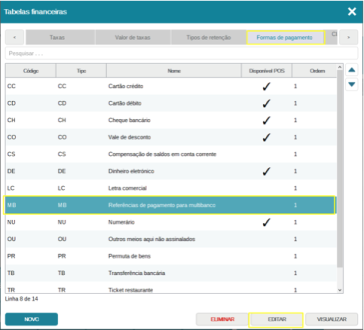 - No separador Formas de pagamento, selecione a opção Referências de Pagamento para multibanco e faça Editar