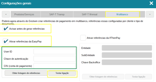 - Para Easypay: Ative a opção que diz Avisar antes de gerar referências e Ativar Referências da Easypay e preencha com os dados solicitados de: ID, Chave de autenticação e CIN (estes dados estão disponíveis na sua conta Easypay).
