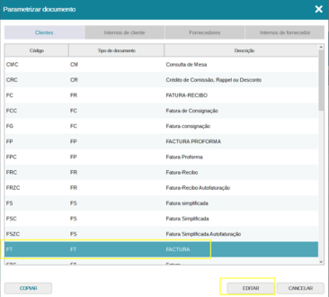 - Selecione o tipo de documento para o qual deseja ativar as referências multibanco e faça Editar.
