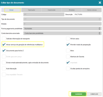 - No separador Geral ative a opção Ativar serviço de geração de referências multibanco e faça Guardar.